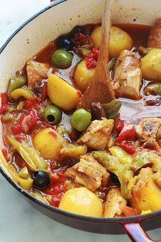 Délicieux plat complet et équilibré : poulet aux poivrons et pommes de terre fondantes en sauce tomate. Ce sont des morceaux de blanc de poulet sautés puis mijotés avec des légumes dans une sauce tomate. Une recette simplissime, facile et économique!