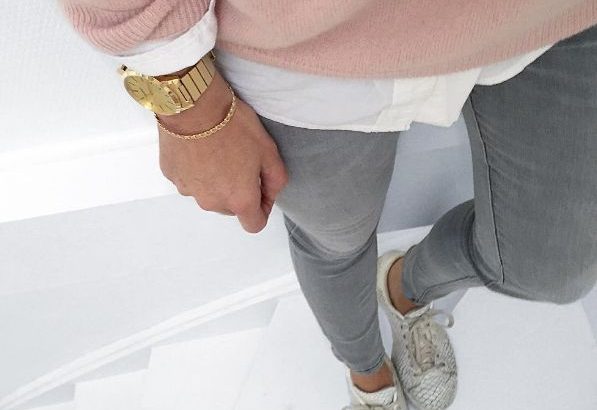 Skinny gris + pull rose poudrée + chemise blanche qui dépasse + sneakers + montre bijoux