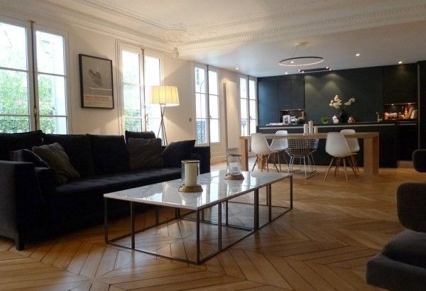Pour le ton du parquet (miel) pour l'idée du marbre gris clair en table de salle à manger (plutôt qu'en table basse) – Par contre gris au mur trop foncé et pas de bois clair dans la pièce à part le parquat