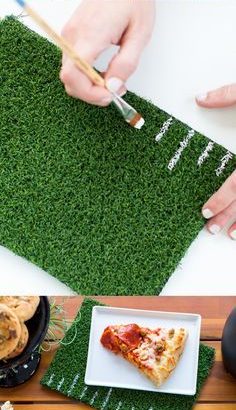 Take your football tailgate up a notch with these DIY turf placements from our partner, Sugar & Cloth – For DIY Living. Supplies: DIGIORNO Original RISING CRUST pizza, astro turf, scissors, paint brush, white craft paint. 1. Cut astro turf to rectang…